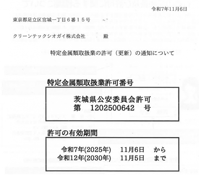 【茨城県】の特定金属許可証が新規認可が完了しました!